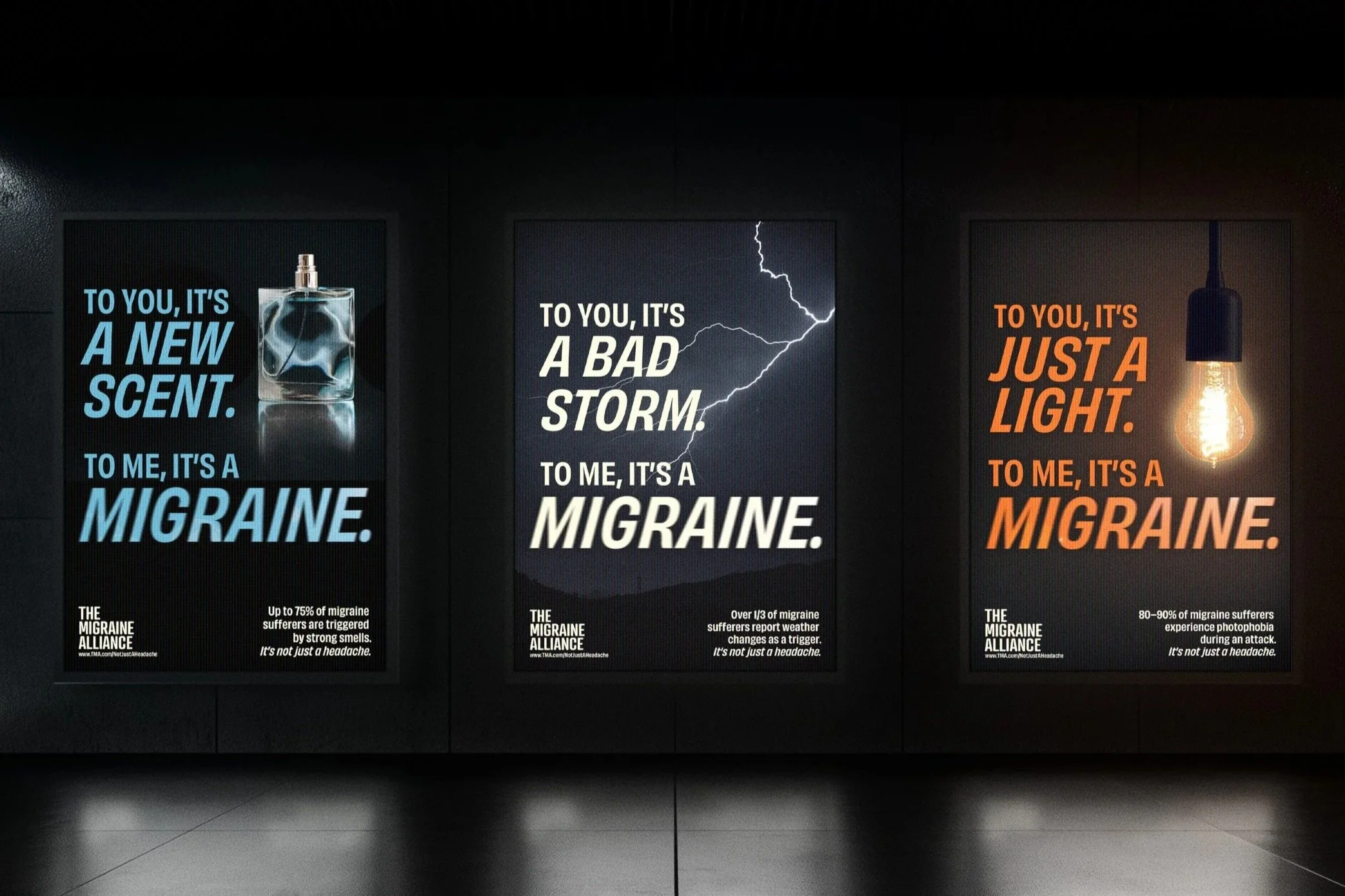 Using immersive visuals and emotionally driven narratives, the work invites audiences to experience the disorientation, sensitivity, and isolation associated with migraine. The campaign balances striking, attention-grabbing design with an empathetic tone, encouraging broader public understanding while empowering those who live with the condition to feel seen and represented.